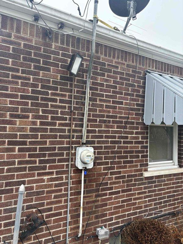 Completed inspection of electrical service riser mounted on exterior brick wall. The existing riser conduit extends from meter box to roofline, with visible wiring requiring replacement as requested by customer. Photos documented current installation condition including meter box placement and conduit path for reference during upcoming replacement work.