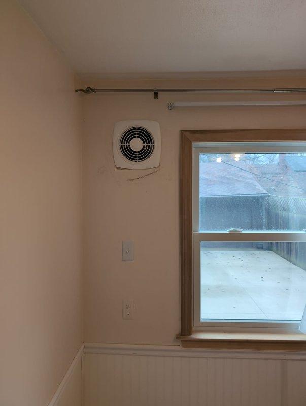Installed new bathroom exhaust fan unit on interior wall, replacing existing ventilation system. Verified proper electrical connections to the two nearby outlets and ensured proper mounting to eliminate previous wall discoloration. System now functioning correctly with proper ventilation flow.