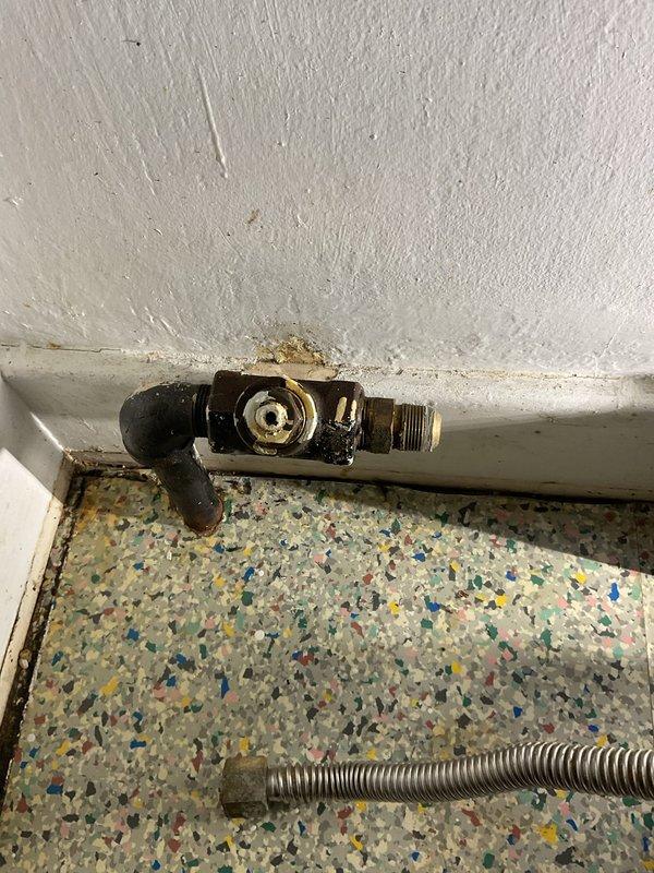 Successfully replaced deteriorated kitchen floor shut-off valve serving the stove water line. Removed old valve showing signs of mineral buildup and water damage at the wall connection. Installed new brass shut-off valve with proper threaded connections to existing plumbing and verified proper operation with no leaks.