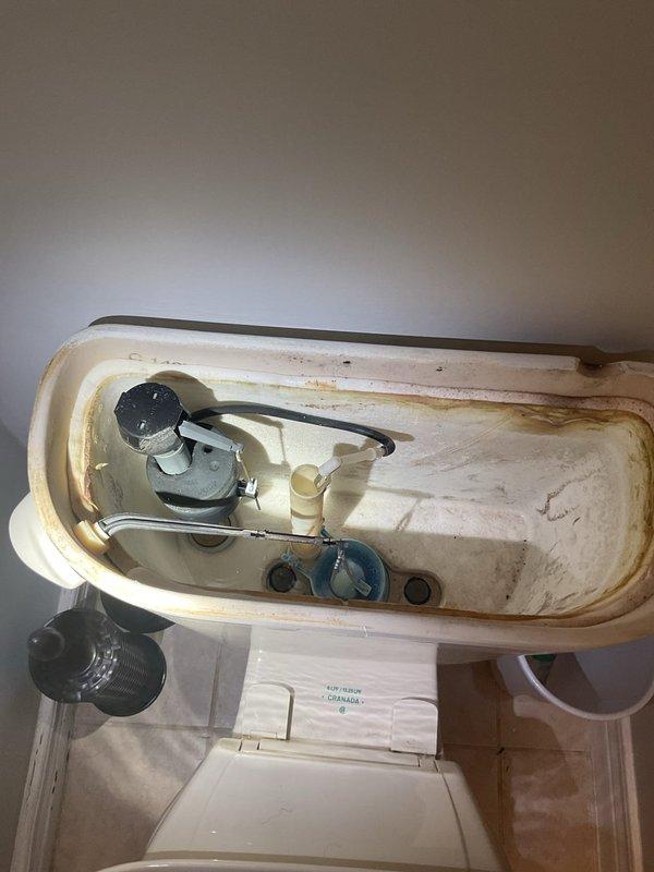Responded to service call for toilet leaking from supply line connection. Upon inspection, found significant mineral buildup and staining inside tank indicating long-term water exposure issues. Repaired leaking supply hose connection after receiving proper authorization from property manager.
