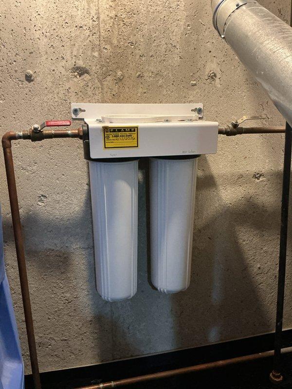 Replaced water filters in dual-housing filtration system mounted on basement wall near desk area. System includes copper inlet/outlet piping with shut-off valve. Documented installation with photos showing proper filter placement and system integrity.