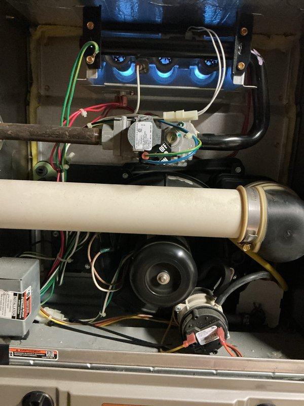 Diagnosed intermittent operation issue on 5-year-old furnace. Performed electrical testing with clamp meter, measuring 0.75A current draw and 3.5Hz frequency on control circuit. Inspected ductwork for proper installation and airflow restrictions. Resolved issue and verified proper system operation.