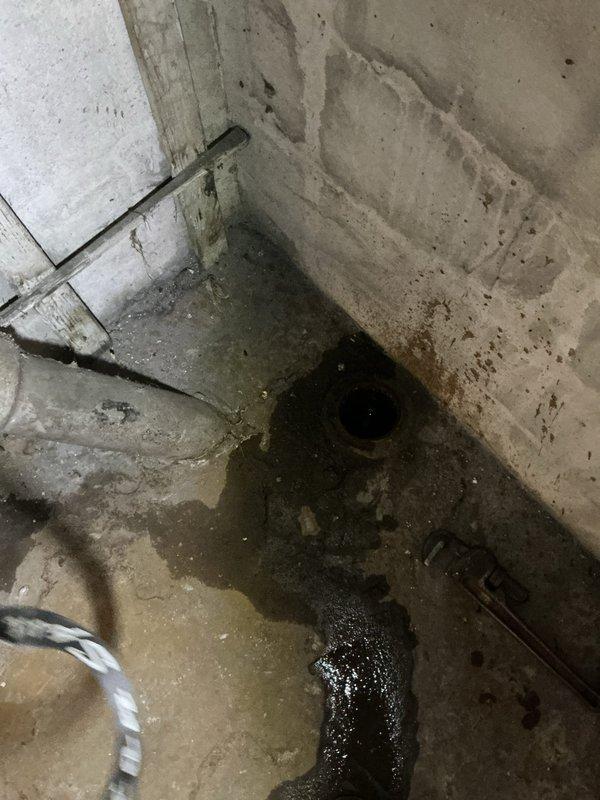 Responded to service call for sewage drain trap issues in basement storage room of century home. Upon inspection, found standing water and significant water damage around floor drain with visible deterioration at wall-floor junction. Removed drain trap, performed thorough clean-out of accumulated debris, and restored proper drainage function to resolve the recurring backup problem.