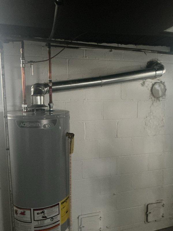Successfully installed a new 4" x 35' chimney liner and vent kit for an A.O. Smith water heater. Properly connected the horizontal ventilation duct to the existing wall opening and ensured all connections were secure and code-compliant.