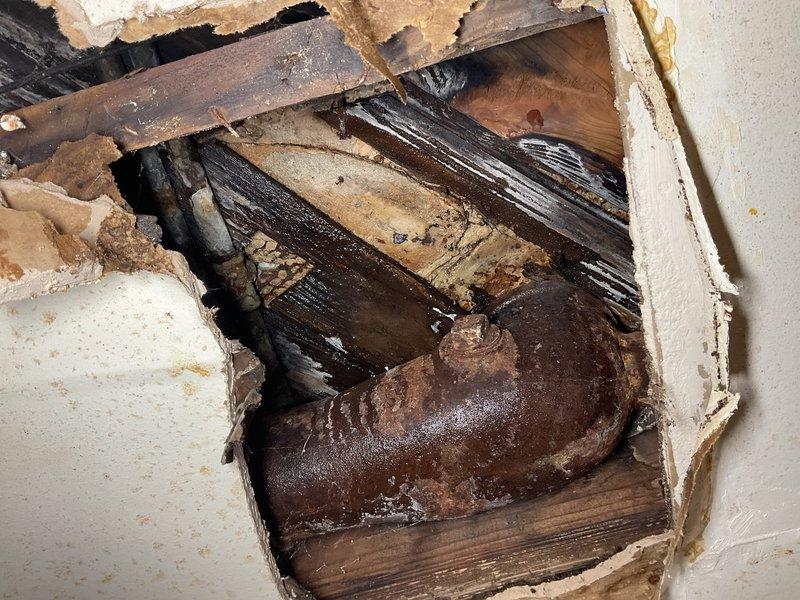 Responded to emergency water leak service request. Upon inspection, discovered severely corroded supply pipe within ceiling cavity causing slow drip. Opened damaged ceiling section, removed deteriorated pipe section showing extensive rust damage and aging, and replaced with new copper fittings to prevent further structural water damage to the century-old home's wooden joists and surrounding materials.