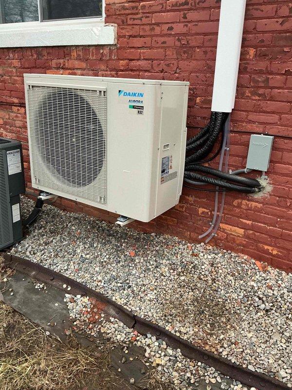 Responded to service call for recently installed Daikin AURORA mini-split system displaying error code with only fan operation and no heating/cooling capacity. Diagnostic inspection of the exterior condenser unit revealed proper installation with insulated refrigerant lines and appropriate drainage setup. System is under both parts and labor warranty; corrected error code issue and restored full heating/cooling functionality.