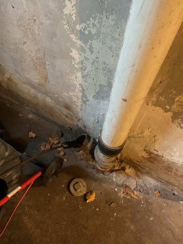 Performed sewer drain cleanout and camera inspection in basement utility area, addressing a deteriorating drainage system with visible water damage. Inspected vertical PVC pipe connection showing rust and sediment buildup at base, documenting evidence of long-term moisture issues and potential leakage points.