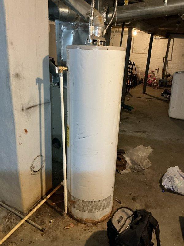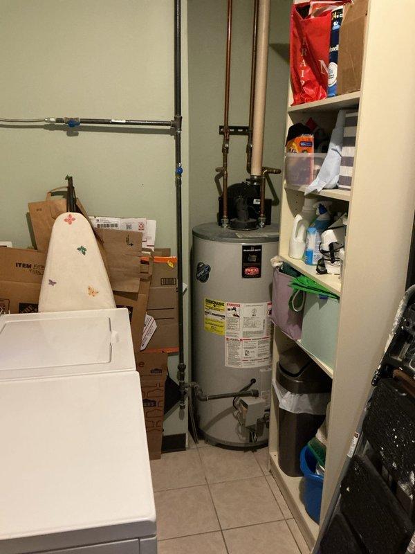 Provided estimate for replacement of existing 40-gallon residential gas water heater located in utility room. Unit assessed for specifications, venting requirements, and installation access, with measurements and site conditions documented via photographs for accurate quote preparation.