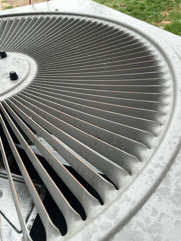 Completed comprehensive Gold AC inspection on 10-year-old residential air conditioning system with air handler located in basement. Performed visual inspection of outdoor condenser unit, confirming operational status and examining fan assembly, protective grille, and housing condition. Unit showed normal weathering and surface wear consistent with age and outdoor exposure. Documented equipment condition through photographic records. System confirmed operational at time of inspection with no immediate service concerns identified.