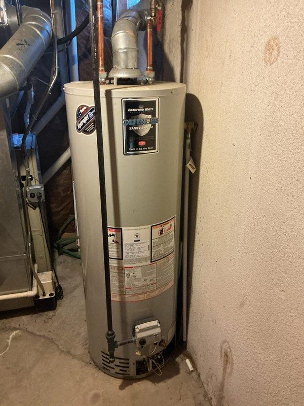 Responded to no hot water complaint and inspected Bradford White Defender Safety System water heater in basement mechanical room. Evaluated unit condition, connections, and operational status. Documented existing installation with copper supply piping and brass fittings for service records.