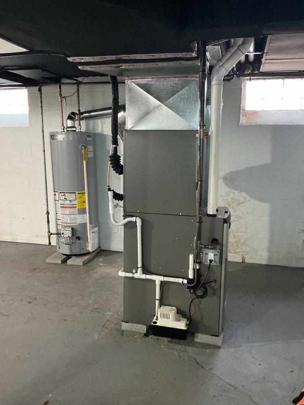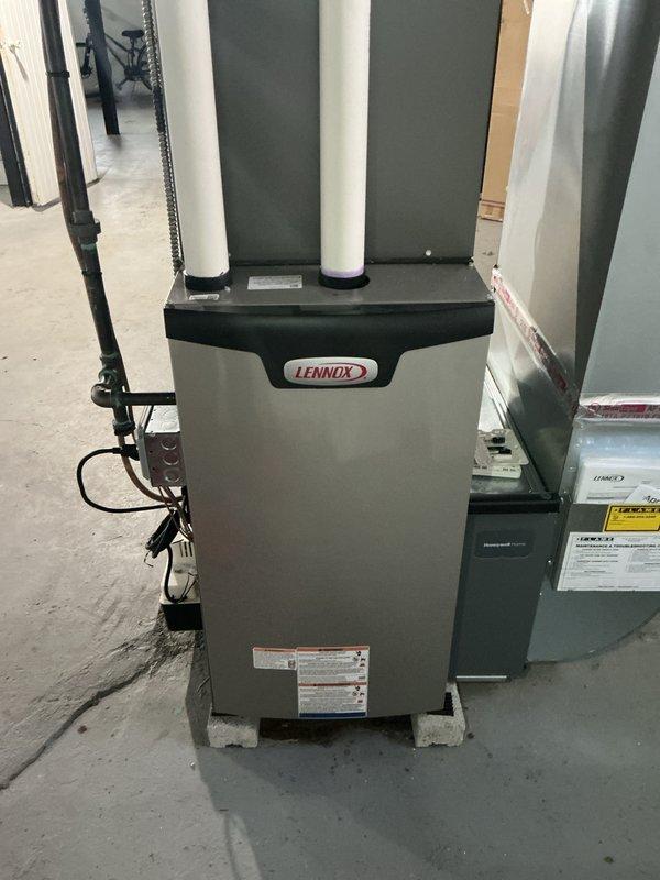 Completed full HVAC system installation including Lennox 70,000 BTU furnace and 2-ton air conditioning unit in rear yard location. Installed new thermostat, condensate pump, and ductwork with liner, performed all mechanical reconnections, and coordinated electrical work. Mechanical and electrical permits obtained, system registered for utility rebate program with AHRI certificate 21558456, and all equipment labeled and documented per code requirements.