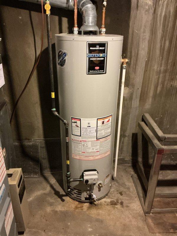 Installed a 40-gallon Bradford White tanked water heater in basement utility room, completing all copper piping connections for inlet and outlet lines with appropriate valves and fittings. Permit was requested for the installation, and the unit was properly secured and vented according to manufacturer specifications and local code requirements.