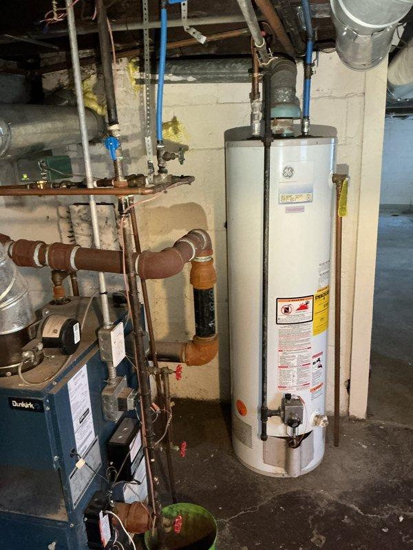 Diagnosed and repaired 2012 GE tanked water heater in 60-year-old commercial building that was non-operational. Inspected aging plumbing infrastructure including iron pipes showing corrosion and PEX/PVC modifications. Restored hot water service to entire facility after component replacement and system testing.
