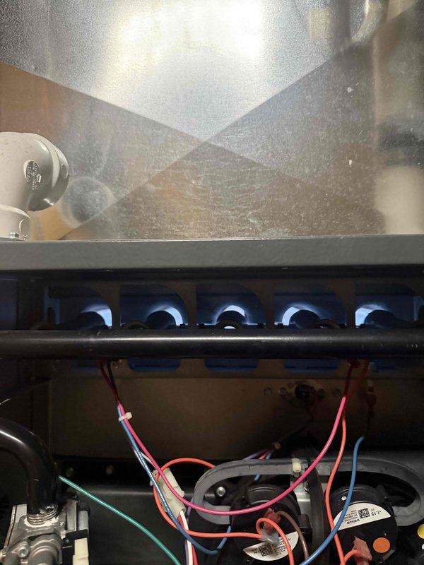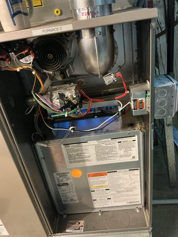 Performed comprehensive tune-up service on 6-year-old furnace located in basement. Inspected wiring connections (red, blue, green, white) to control system components and verified proper function of burner assembly. Evaluated heat exchangers and reflective metal surfaces for optimal operation, confirming all systems are operating within manufacturer specifications.