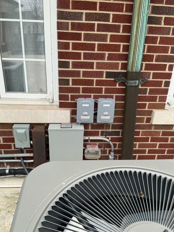 Completed inspection of exterior electrical service installation including main panel, meter, and associated utility boxes mounted on brick exterior wall adjacent to HVAC equipment. Verified proper mounting and connections of all electrical components with no visible damage or deterioration detected. Photos taken to document current condition of installation for service records.