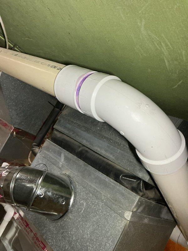 Responded to customer report of water dripping from furnace exhaust following recent furnace replacement. Inspection revealed condensation issue at the exhaust connection point. Installed proper PVC piping with appropriate slope and sealed joints using purple primer to ensure proper drainage and prevent future leaks.