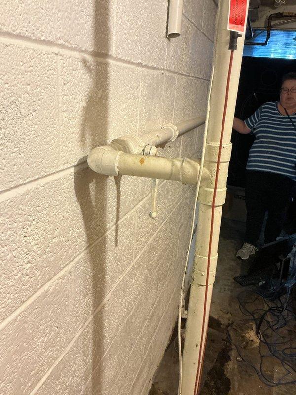 Completed on-site assessment for sump pump installation in basement of 1950s-era residential property. Evaluated existing plumbing infrastructure and provided estimate for new sump pump system, backflow prevention valve/assembly replacement, and interior sprinkler system capping. Documented existing PVC drainage line configuration mounted to basement cinder block wall for reference in final installation specifications.