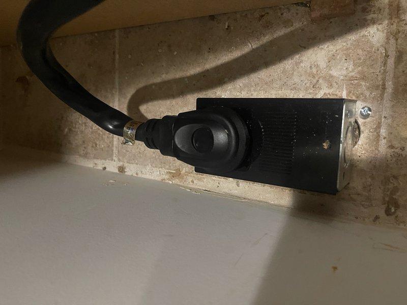 Responded to service call regarding recently installed electrical outlet for stove connection. Inspected existing outlet mounted on concrete block wall and discussed rotating receptacle 90 degrees to accommodate appliance cord orientation. Documented current installation with photographs showing outlet box properly secured to wall with cord connected and verified electrical functionality prior to any modifications.