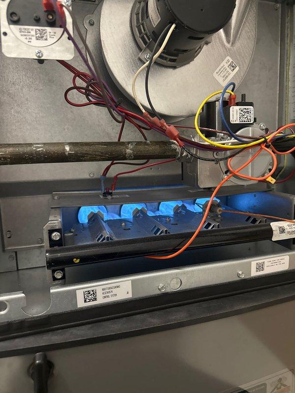 Performed routine tune-up on gas furnace of undetermined age. Conducted combustion analysis using Fieldpiece digital meter to verify proper operation. Inspected burner assembly which displayed appropriate blue flame pattern, indicating efficient combustion and proper gas-air mixture. All components functioning normally with no issues detected.