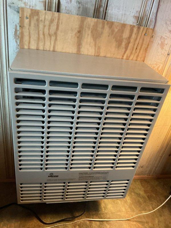 Diagnosed and serviced wall-mounted space heater experiencing thumping noises after three years of operation. Inspection revealed loose mounting hardware causing vibration against the wooden wall panel during operation. Secured unit properly to the plywood backer and verified proper functioning with no abnormal noise during extended test cycle.