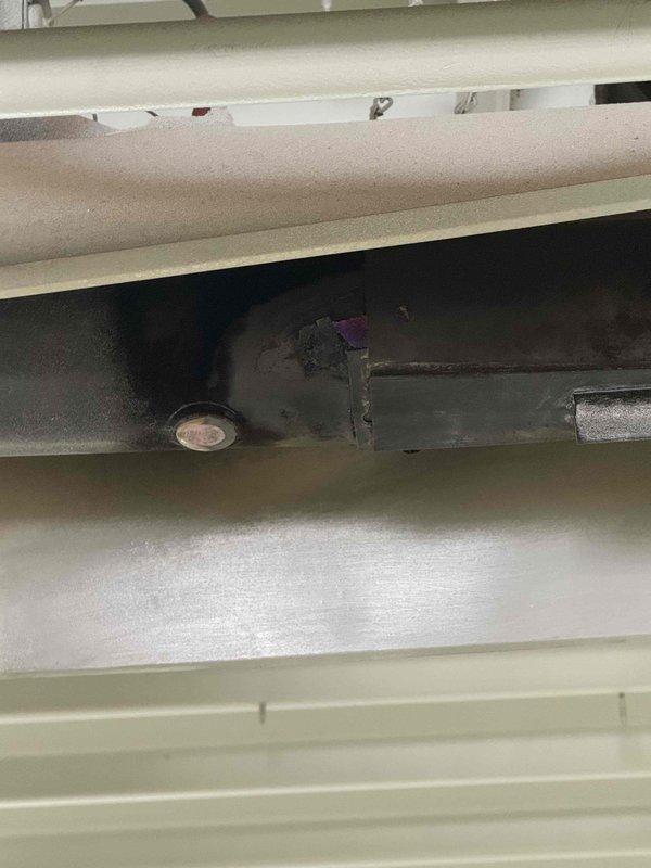 Responded to service call for heating duct baffle making unusual noise. Upon inspection, found mechanical component within housing showing signs of discoloration and possible corrosion around mounting hardware. Visual assessment indicated potential deterioration of metal bracket/support structure that may be causing reported noise.