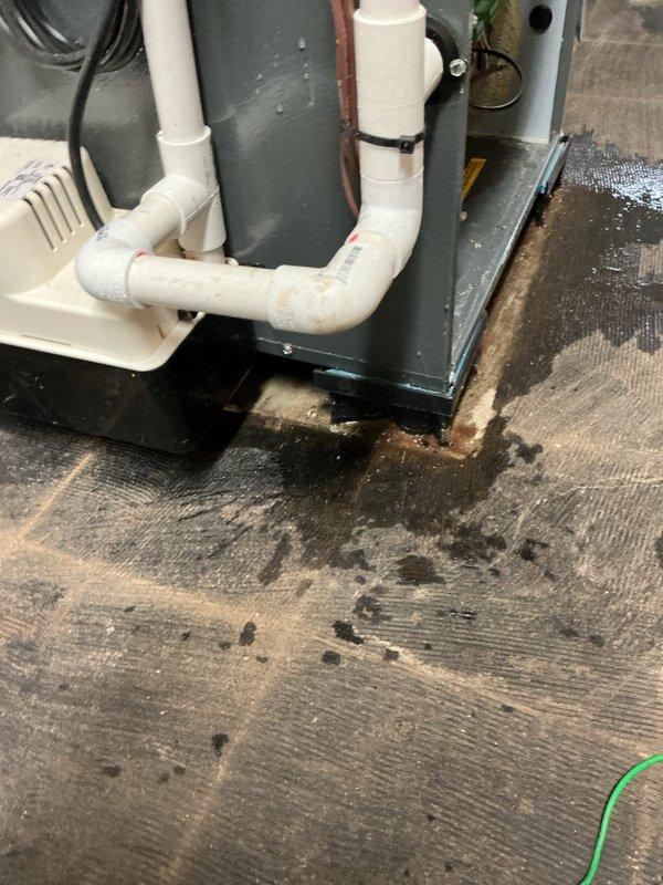 Responded to a service call for water leakage from furnace unit under 10 years old. Upon inspection, identified significant moisture damage on concrete floor surrounding the HVAC system, with water spreading from the base of the unit. Visual documentation was taken to record the condition of the PVC condensate drainage system and extent of water damage.