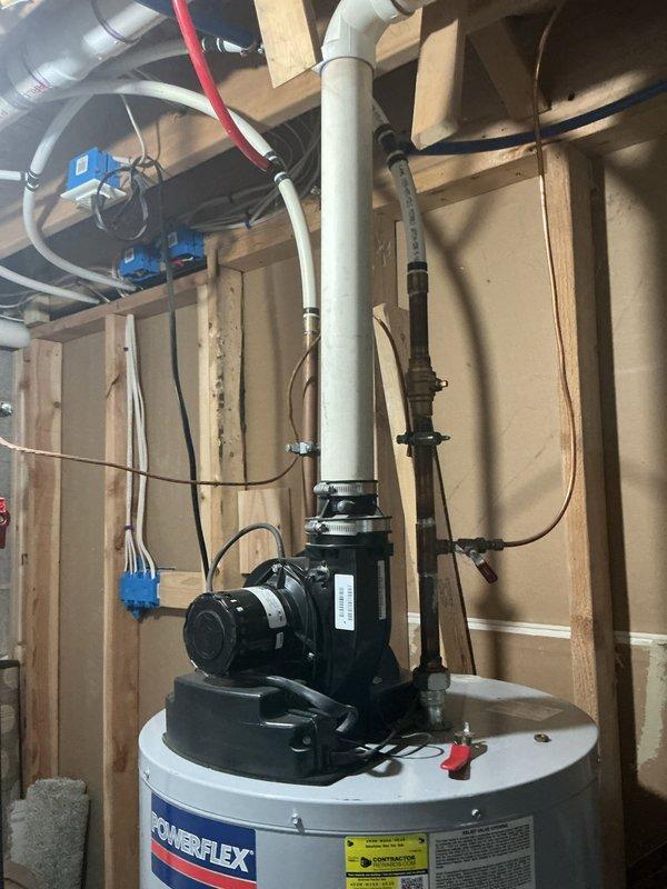 Installed new 50-gallon power vent water heater in basement utility room with required drip pan featuring alarm system. Connected unit to existing copper plumbing lines and verified proper operation. Installation included all necessary safety features and compliance with current plumbing codes.