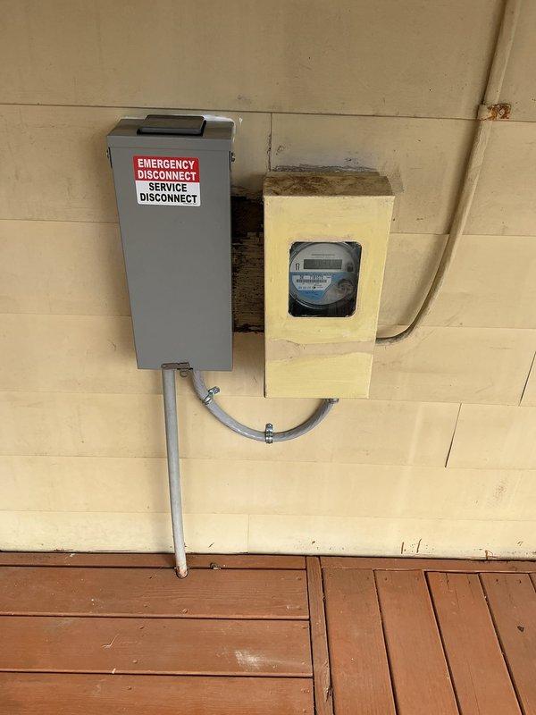 # Electrical Service Report Successfully replaced the main service disconnect box and installed a new 100-amp breaker at the customer's property. The new gray metal disconnect enclosure was properly mounted to the exterior wall with appropriate conduit connections and clearly labeled emergency disconnect signage for safety compliance. The installation was completed with secure conduit routing from the disconnect box, ensuring proper electrical protection and code-compliant service disconnection capability for the 100-amp electrical service.