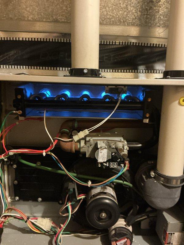 Performed scheduled Gold Plan furnace inspection on a 5-year-old unit located in basement. Inspected burner assembly confirming proper flame pattern with characteristic blue flames and examined heat exchanger for integrity. Checked all electrical connections, inspected blower motor operation, and verified gas valve functionality with no issues identified.