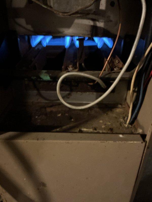 # HVAC Service - Tune-Up Summary Performed comprehensive furnace tune-up and safety inspection on gas-fired heating unit located in basement. Conducted thorough examination of burner assembly, confirmed proper blue flame combustion pattern indicating correct air-fuel mixture, and inspected all internal components, gas supply lines, and electrical connections. Completed multi-point inspection including thermostat operation, humidifier functionality, and hot water tank assessment as requested for rental property certification requirements. # Detailed Service Report Completed full seasonal maintenance and safety inspection on residential gas furnace system. Upon arrival, accessed unit in basement and performed visual assessment of overall system condition. Unit age was undetermined based on available information. Conducted ignition system inspection and verified proper burner operation. Observed burner assembly during firing cycle, confirming characteristic blue flame pattern across a