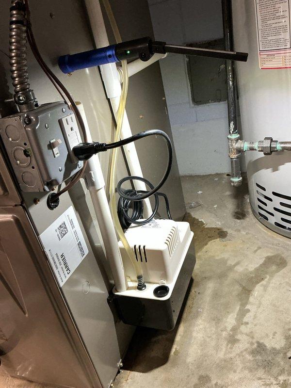 Diagnosed water leak originating from condensate pump in basement. Replaced faulty condensate pump and verified proper operation of furnace system. No further water accumulation observed after repair.