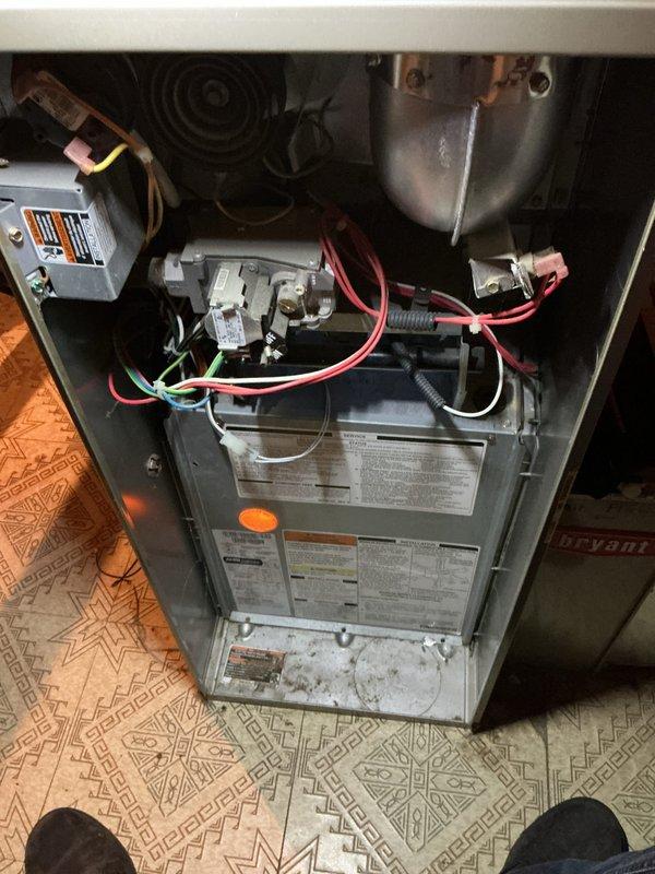Performed Gold Furnace Inspection on 10-year-old Bryant furnace located in basement. Inspected interior components including control board connections, gas valve assembly, and wiring. Noted minor dust accumulation in unit housing requiring cleaning for optimal performance.