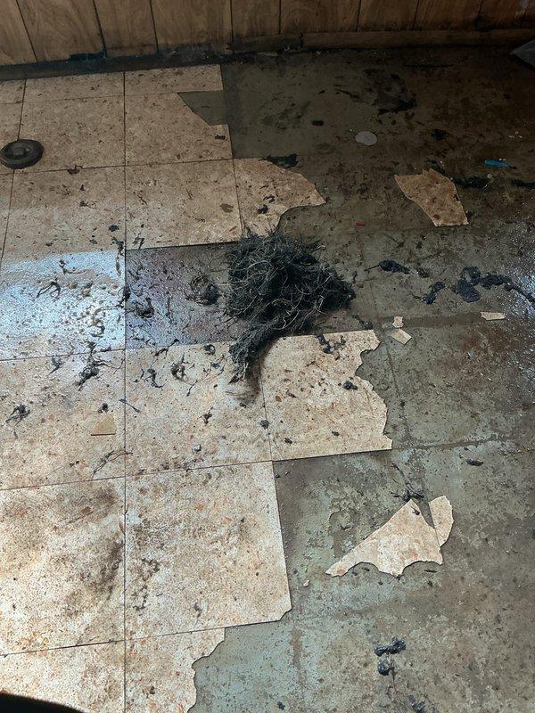 Responded to service call for main drain backup. Performed cable service to clear blockage in main drain line. Observed significant floor damage in the affected area including cracked/missing tiles and accumulated debris, which was documented with photos for record purposes.