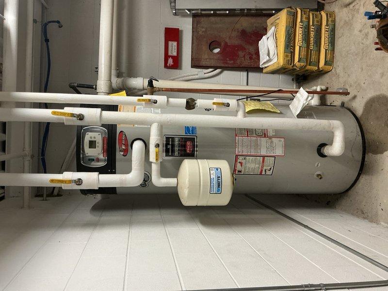 Responded to service call for a commercial 75-gallon water heater with reported leakage and temperature regulation issues. Upon inspection, identified minor leak at connection point and faulty thermostat causing temperature to drop to 64°F after reset. Replaced thermostat, tightened pipe connections, and verified proper operation of expansion tank and relief valve. System now maintaining consistent temperature with no visible leaks.