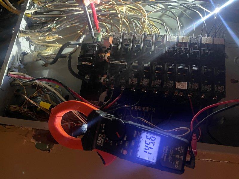 Responded to report of voltage fluctuations and flickering lights occurring when microwave was operated. Performed diagnostic testing at main electrical panel using digital clamp meter to measure voltage and current levels. Measured readings at circuit breaker panel to identify potential issues with electrical supply stability, loose connections, or circuit overload conditions affecting the microwave circuit and associated lighting.