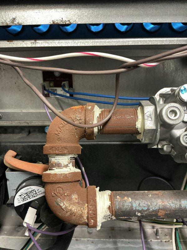 Performed Gold Boiler Inspection and identified significant corrosion at pipe connections with visible water leakage from the unit. Documented extensive deterioration at joint areas with rust and mineral deposits, particularly around the expansion tank connection to copper piping. Photos were taken to document the condition for further assessment of repair needs.