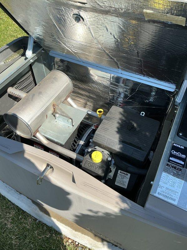 Performed preventative maintenance service on a 14kW Kohler residential generator. Inspected internal components including engine block, exhaust system, and electrical connections. All systems functioning properly with no issues identified during visual inspection.