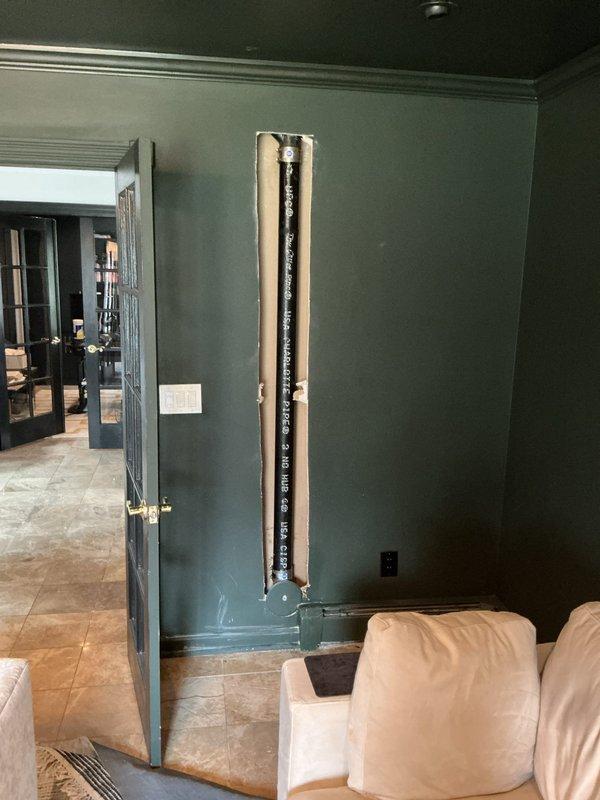 # Plumbing Service Report Completed installation and repair of gas line stack system in residential interior space. Installed vertical copper gas pipe running from ceiling to floor with proper fittings and connections at both termination points, ensuring secure mounting along wall surface and compliance with gas line installation standards. All connections were tested and verified for proper operation and safety.