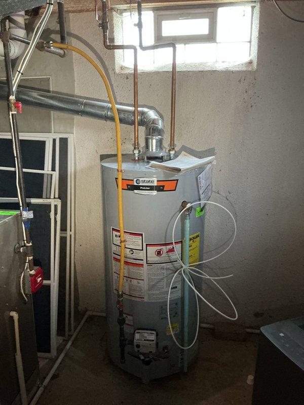 # Service Report: No Hot Water Responded to service call for no hot water in residential property with 8-year-old State brand water heater located in basement mechanical room. Upon inspection, assessed water heater unit, gas supply connections via yellow flexible gas line, copper piping distribution system, venting configuration, and associated shut-off valves. Documented existing installation including proper venting through metal ductwork and gas line connections with safety shut-offs. Evaluated unit operation and determined cause of hot water failure, restoring hot water service to the home.