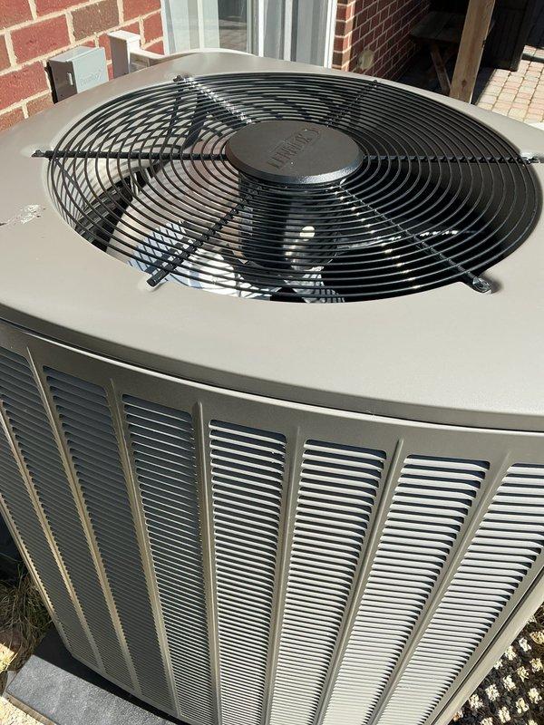 Completed AC start-up service on outdoor condensing unit adjacent to brick structure. Unit was confirmed to be properly installed on concrete pad with adequate clearance for airflow. System was powered on, tested for normal operation, and all performance parameters verified within manufacturer specifications.