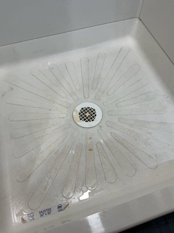 Responded to service call for clogged basement shower drain in Mustee fiberglass shower basin. Performed drain cleaning service to remove blockage, successfully restoring proper drainage function. Verified operation with water test and documented condition with photos.